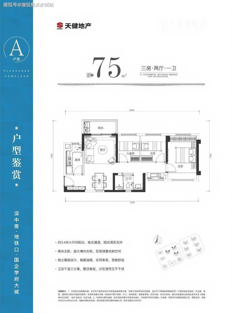 75㎡的3房2厅1卫,设计的是竖厅南北通透格局,进门入户玄关,客厅3.4米开间,L型厨房,卫生间三段式分离,得房率82%(不含赠送),阳台朝西北或东北向。