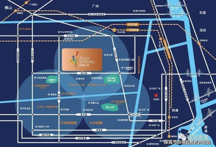 項目總占地355畝,總建築面積約60萬平方米;集低密度藝墅、品質洋房、商業中心、時尚會所、五月花電影城等於一體大型國際人居社區,滿足城市精英多元化的雅致生活需求。是中山城區不可多得之品牌大盤,專案目前在售組團分別由棕櫚巒、彩虹豪苑、彩虹新苑組成。