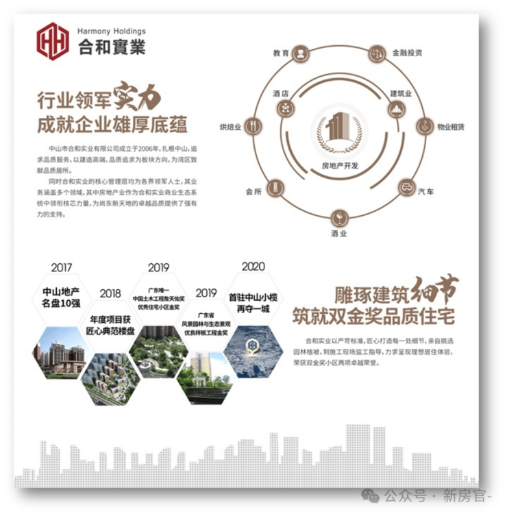 中山市合和实业有限公司成立于2006年, 扎根中山,旗下业务涉及酒店、烘焙、房地产开发、物业租赁、投资实业等,追求 品质服务,以建造高端、品质追求为板块方向,为湾区致献品质居所。