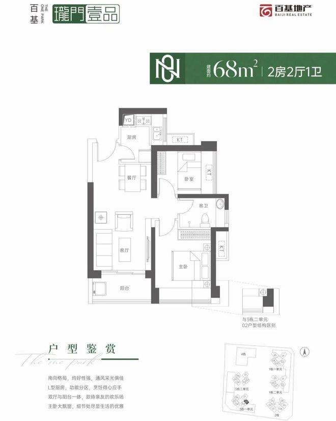 仅3栋1单元02户型,设计的是竖厅格局,客厅3.4米开间,LDKB一体化设计,L型厨房,卫生间干湿分离,东南朝向。
