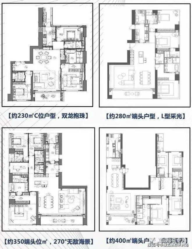 户型信息:主力户型为建面约230 - 700㎡的环海大平层,部分户型支持定制整层约2100㎡的户型,具体有建面232㎡的 1室1厅1卫、建面400㎡的 4室3厅5卫、建面500㎡的5室3 厅6卫以及建面700㎡的6室3厅7卫等多种户型。