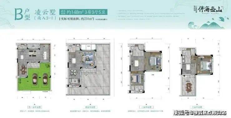 凌云墅B户型(南入户)建筑面积约148㎡,实际可用面积约231㎡(不计花园及露台)