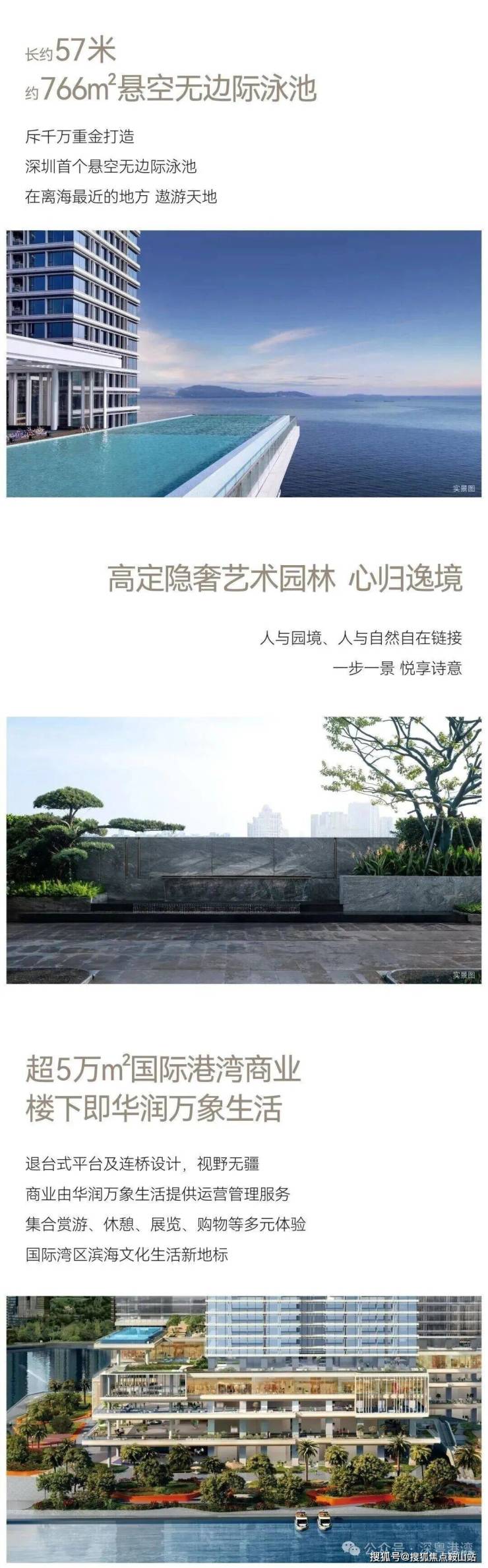 内部配套:配备高端私密会所、约 766 平方米的深圳首个悬空无边际海景泳池、首层城市花园、健身房、儿童游乐区以及 1800 平方米的海洋博物馆等设施。