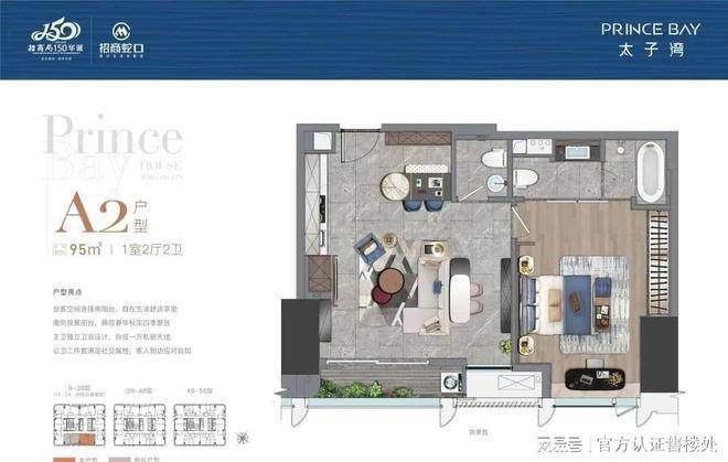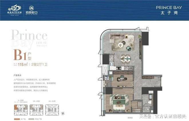【太子湾•泓玺】总高194米,共1栋,分为顶高低三个区域,低区9-38层4梯8户,面积为88-95-115-125㎡;高区39-48层4梯6户,面积为88-115-226㎡;顶层49-50层4梯4户,面积为216-226㎡,