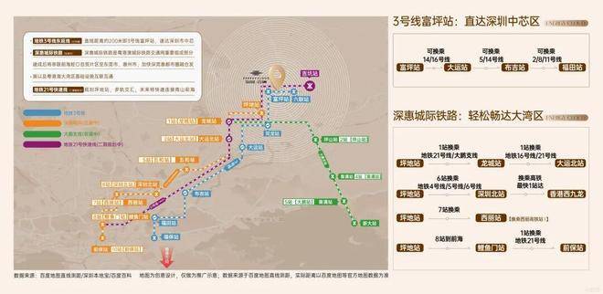 创城云璞交通配套极为完善,地铁3号线东延线富坪站已开通,距离项目仅约200-300米,步行10分钟可达。乘坐3号线到大运站可便捷换乘14号线,30分钟直达福田中心区。深惠城际轨道线坪地站预计2026年11月开通,时速160公里,1站到龙城、2站大运北、6站到深圳北、7站到西丽、10站速达前海,实现"1小时湾区生活圈"。