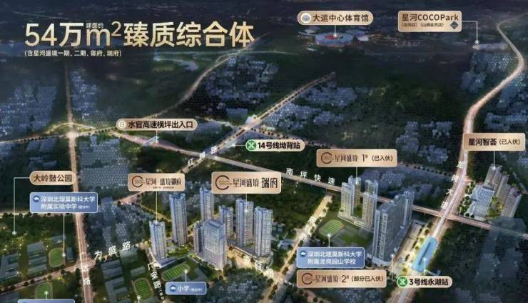 星河盛境3期,位于深圳市龙岗区园山街道,地处大运板块核心区域,毗邻地铁3号线永湖站及14号线坳背站,是双地铁覆盖的TOD综合体项目。