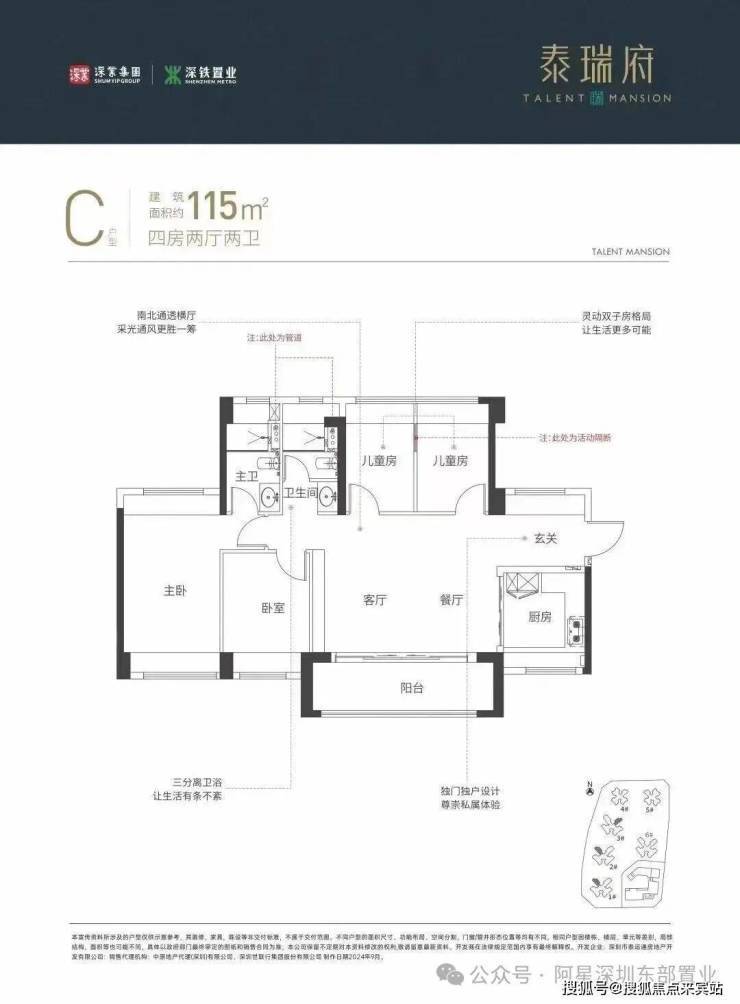 115㎡的4房2厅2卫,设计的是横厅南北通透格局,进门入户玄关,客餐厅5.85米开间,四开间朝南,4个卧室分别做的3.2米/2.5米/2.15米/2.15米的宽度,主卧南北通透设计,U型厨房,公卫三段式分离,得房率:77.48%(不含赠送),阳台主朝西南或东南向。