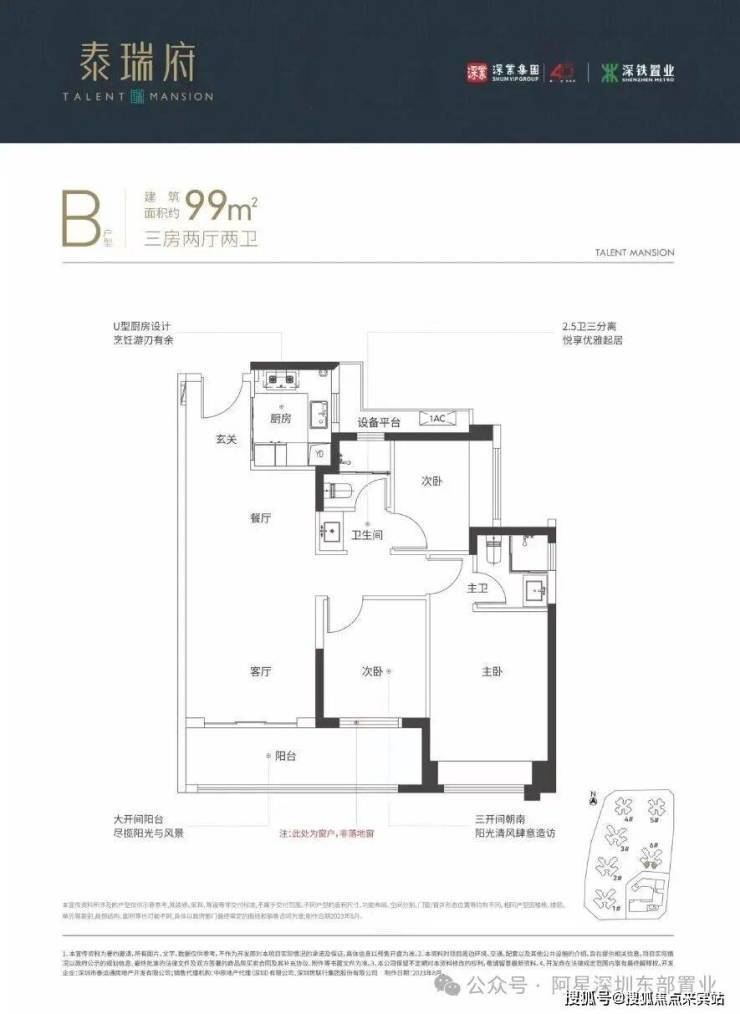 99m的3房2厅2卫,设计的竖厅格局,客厅连着卧室出大阳台,U型厨房,有东南朝向及西南朝向。