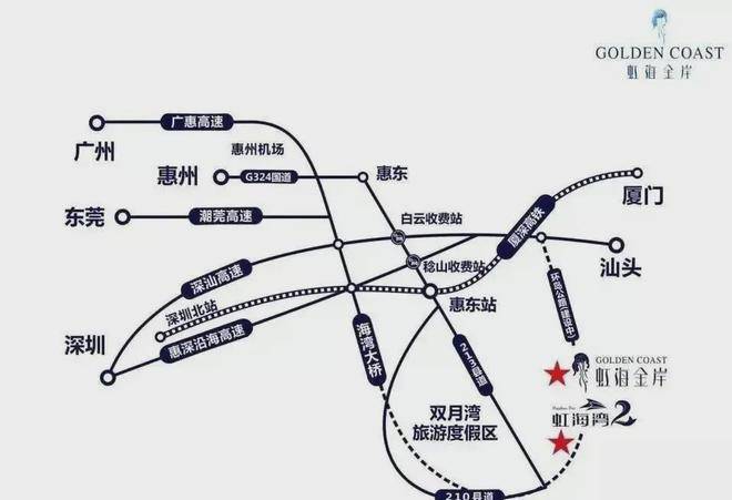 深汕高速(白云出口)——G324 国道——X210/X213 县道——虹海金岸