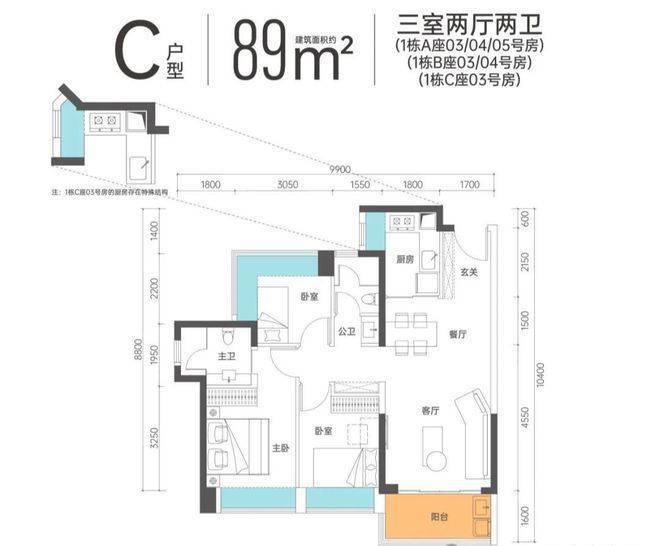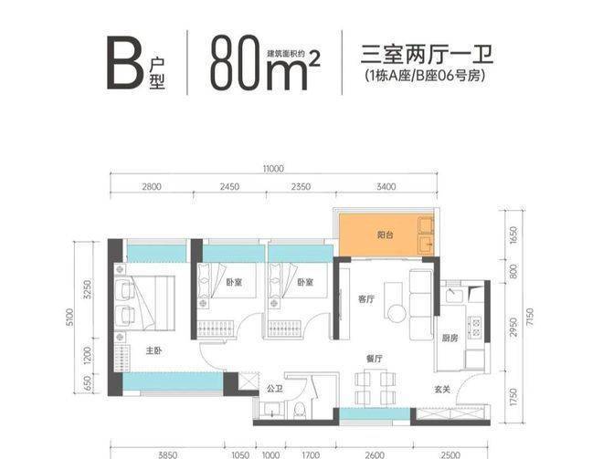 约80㎡3房,相比于市面同户型做到了通透对流,餐客厅对流通风佳,主卧也是做到了通透对流