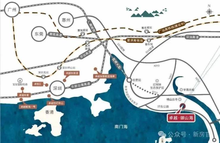 在交通方面,卓越御山海尽享多维立体交通网络 ,构建了便捷的旅游生态圈。四条高速:沿海高速、深汕高速、潮莞高速、广惠高速 ,让你能够快速抵达周边城市;三条高铁:厦深高铁、京九高铁,广汕高铁(建设中) ,快速畅行,为出行带来更多便利。此外,项目距离深圳宝安机场、广州白云机场、惠州平潭机场都在合理的车程范围内 ,三大机场吸纳世界各地人群,无论是商务出行还是旅游度假,都能轻松实现。