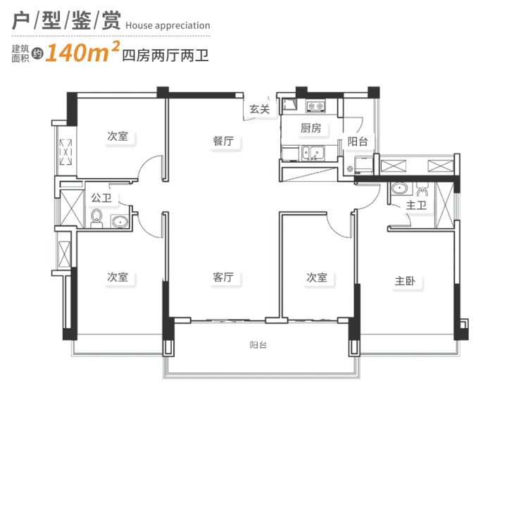 140㎡四房:6.9m景观阳台+8.1m横厅,南北双阳台