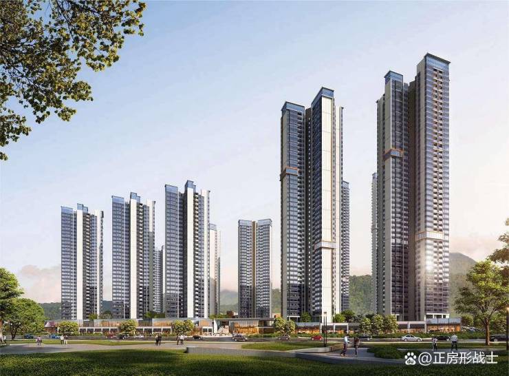 项目外立面采用铝板与玻璃幕墙交织的现代语汇,流畅的横向线条如层叠的山峦轮廓,在光影变幻中勾勒出灵动韵律。建筑群以99-149米错落高度精心排布,既保证每户的观景视野,又形成起伏有致的天际线。园林设计更见匠心——约5.4万㎡示范园林以"一环五组团"布局,240米超尺度围合式景观带中,水幕会客厅与镜面水景相映成趣,约500㎡景观泳池如碧玉镶嵌,15大全龄活动空间巧妙融入绿意环抱。