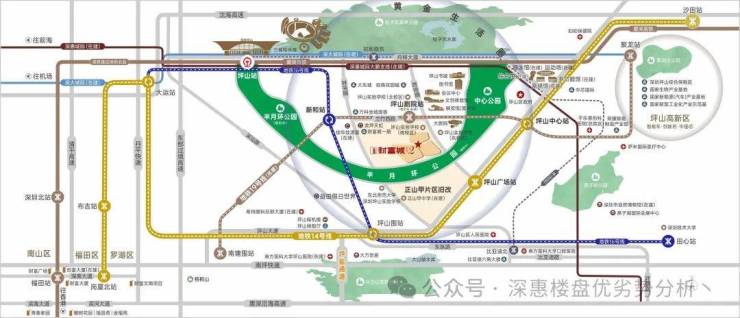交通配套:地铁14/16/19号线共3条地铁线环绕,同时坪山高铁站也在这块,同时还有坪山云巴、南坪快速、深圳外环高速、坪盐通道、沈海高速、东部过境高速等等,出行超级便利