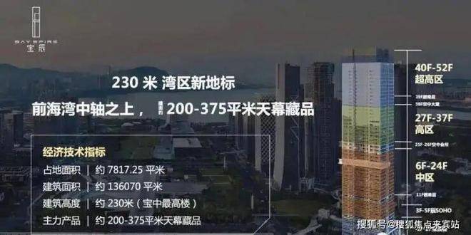 华侨城宝辰总高230米,为宝中最高楼;项目52层,分为中区、高区、超高区,6层起卖,11、39F为避难层,25-26F为空中会所,28F为空中大堂。除了空中大堂项目还有地下入库大堂+首层大堂,一共三重大堂。