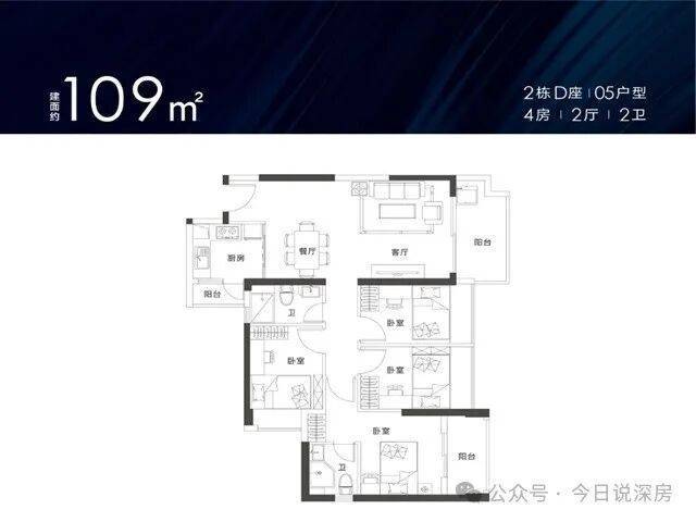109㎡的4房2厅2卫,设计的竖厅格局,客厅主卧双阳台设计,厨房也带小阳台,四开间朝南,客厅朝东南向。