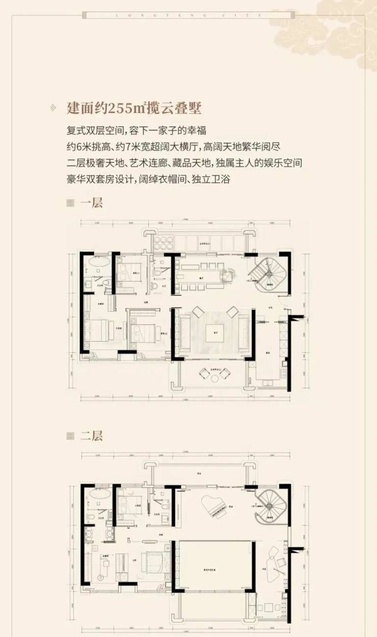 建面约440-837㎡国风院墅(总价约800万-2500万/套),建面约239-255㎡揽云叠墅(总价约500万-600万/套)