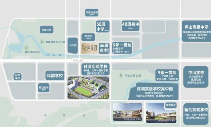 1:科源实验学校就在马路对面,步行一百五十米左右,大片区1.5公里内深实验集团学校预计明年交付,东北侧也规划有教育用地,以后学位不会太紧张