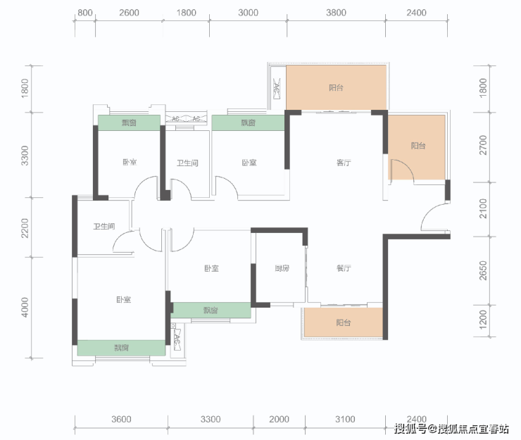 A户型: 86㎡(2+1房,2卫)同级面积稀缺双卫结构、三开间朝南