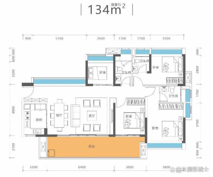 100平3房2卫,