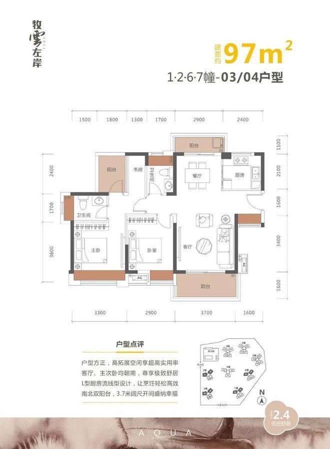 97㎡3房2厅2卫,三阳台,有一个生活小阳台,赠送的小阳台+书房可做儿童房,南北通透双阳台设计且两个卧室朝南还是非常不错的。客厅3.7米,两个卫生间通透性舒适性三房。牧云左岸售楼处电话:400-013-9098