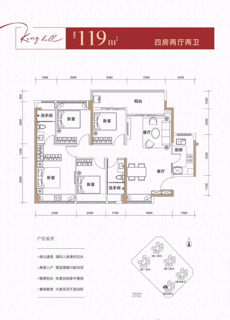 119㎡的4房2厅2卫,设计的是竖厅南北通透格局,客厅4米开间,客厅连接卧室出6.3米长的超大阳台,4个卧室分别做到了3.5米/3米/3米/2.5米的宽度,U型厨房,阳台主朝北向,看园林景观。