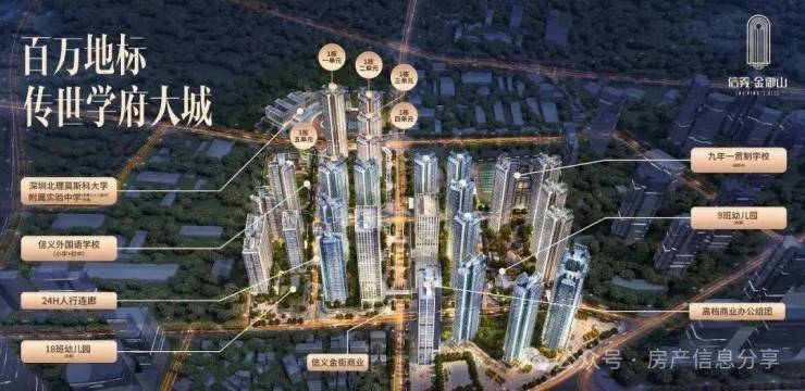 最值得提的就是教育配套。信义金御山是深圳极为罕见的集幼儿园+小学+初中+高中+大学于一体的住宅大盘。项目附近规划有2所九年一贯制学校,其中1所为信义外国语学校(小学+初中)、高中为北理莫斯科大学附属实验学校(深圳市三十三中学)。未来小区楼下还会引进北理莫斯科大学附属中小学