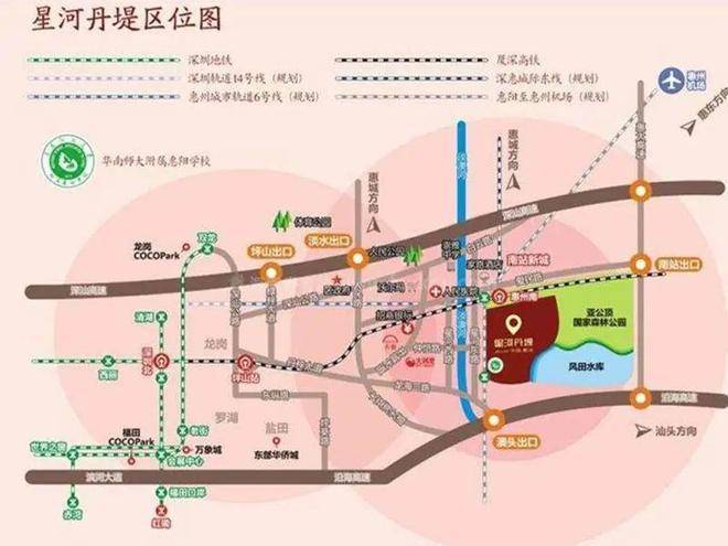 星河丹堤位于粤港澳大湾区腹地, 紧邻双铁枢纽——惠州南站,项目总占地约150万㎡ ,建面约260万㎡,是星河集团在惠州的开山之作。