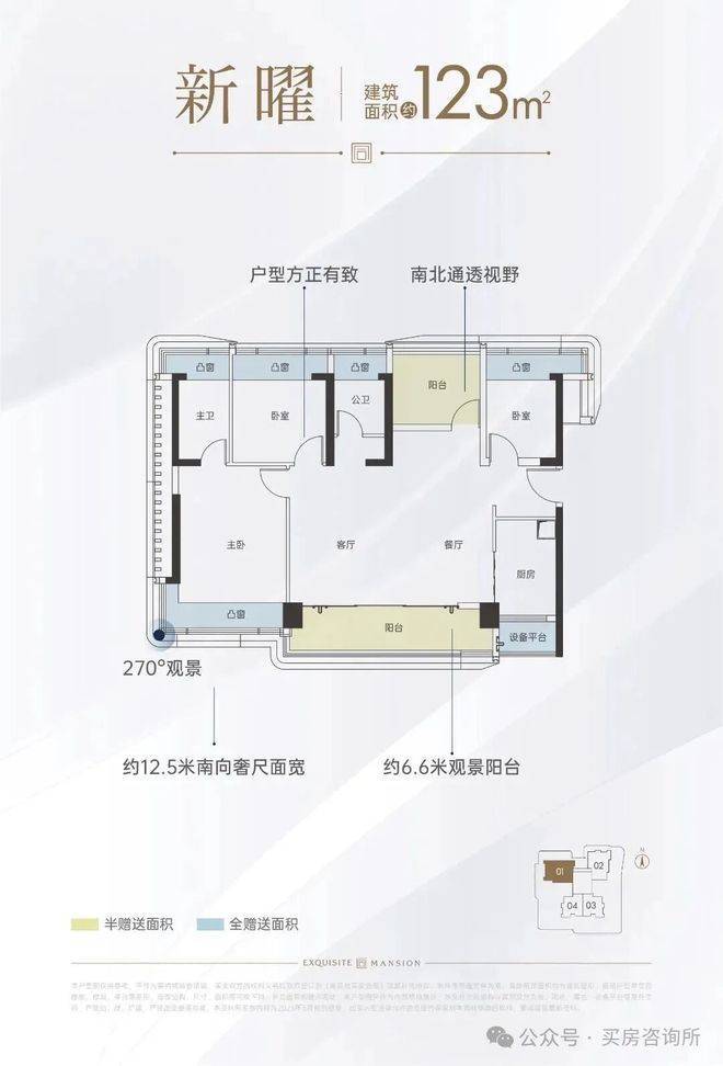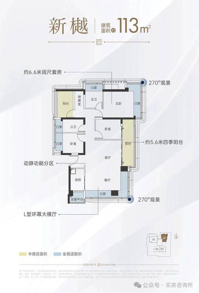 目前91-113㎡户型已经出炉,123㎡户型暂未公布,其中113㎡户型是个亮点,客厅房间基本都是270°转角飘窗采光,使用率高达94%