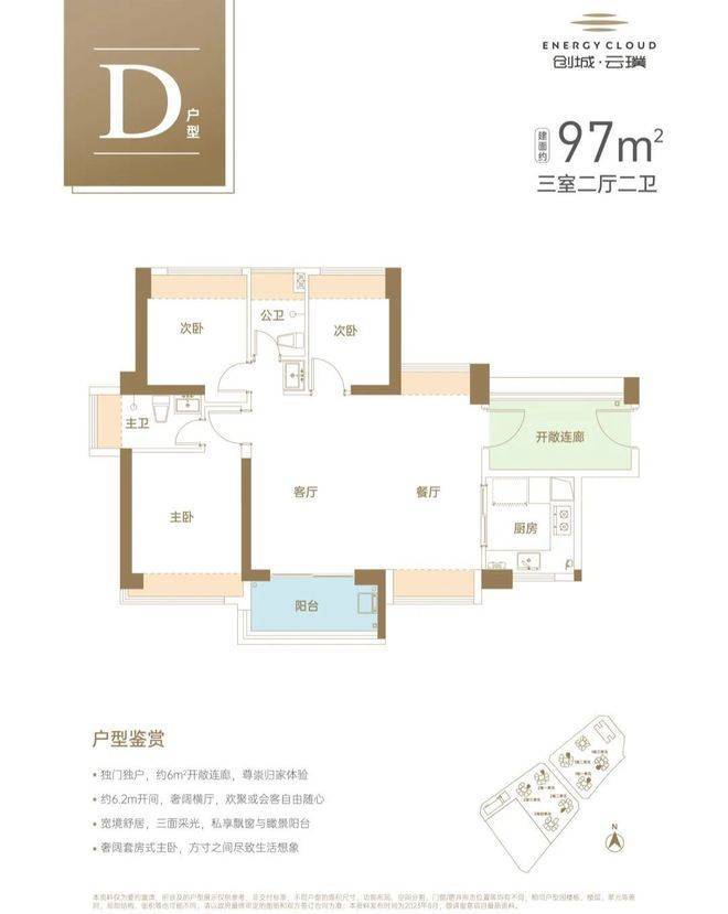 横厅南北通透格局,客餐厅6.2米开间,U型厨房,卫生间干湿分离,有额外赠送一大块入户花园,阳台主朝东南向。