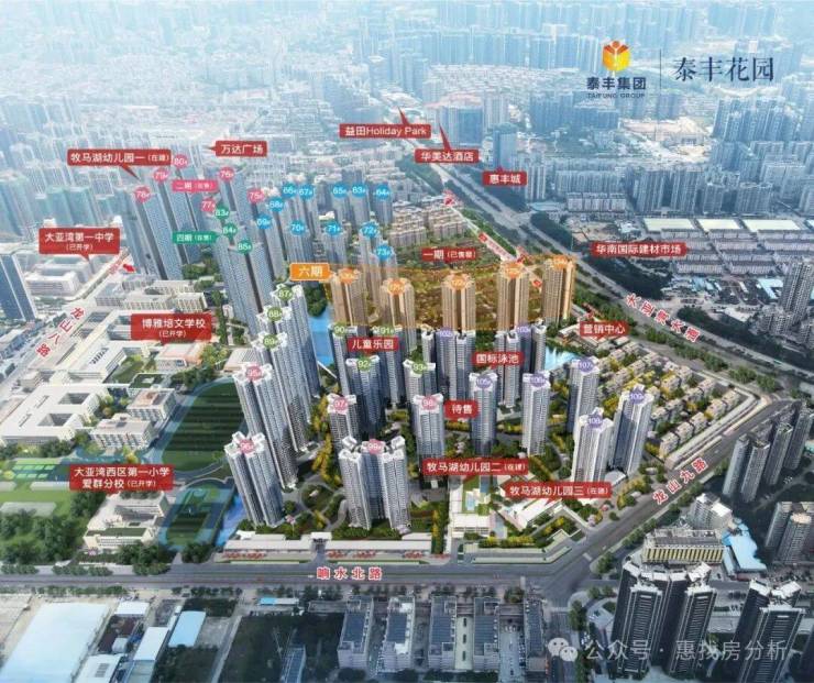 泰丰牧马湖位于惠州大亚湾大亚湾大道旁(万达广场350米)项目总占地面积约55.6万㎡,住宅总建筑面积约101万㎡,项目围绕原生湖泊而建,产品线丰富,涵盖别墅、小高层、超高层等多种产品形态,以打造“未来活居所”为理念,将规划建设成一个“开放型混合功能的全龄型社区。”