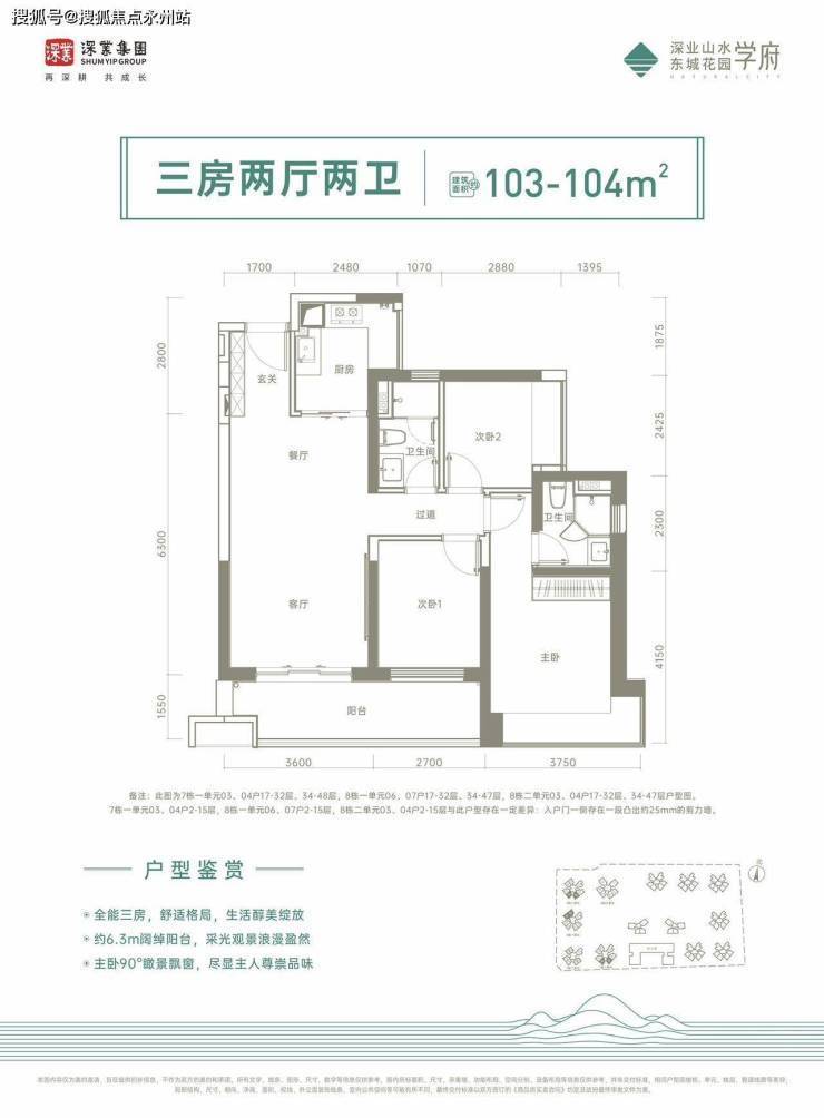 103-104㎡的3房2厅2卫,设计的是经典竖厅格局,进门入户玄关,客厅3.6米开间,LDKB一体化设计,3个卧室,客厅连接次卧出6.3米的大阳台,U型厨房,卫生间干湿分离,西南、东南或西北朝向。
