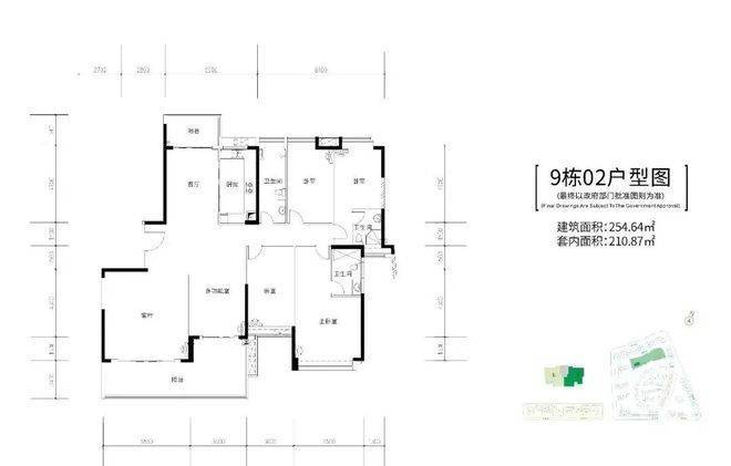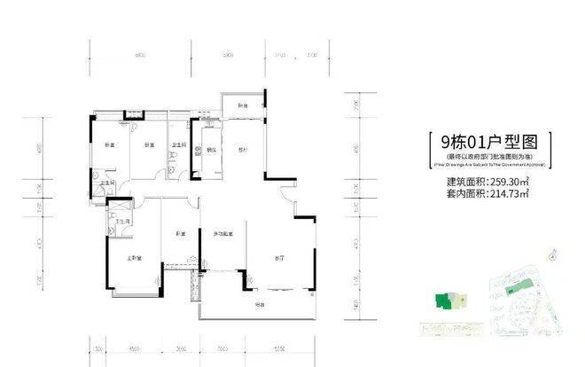 9栋,两梯两户,建面约255-259㎡五房大平层户型
