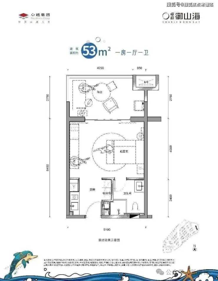 ▲53㎡样板间实景图 片区在售唯一开间达5.1米单房户型 ,视觉更宽广,景观面丰富动人, 阔绰阳台,承载舒阔假日时光, 超大采光面,一览山海景观。