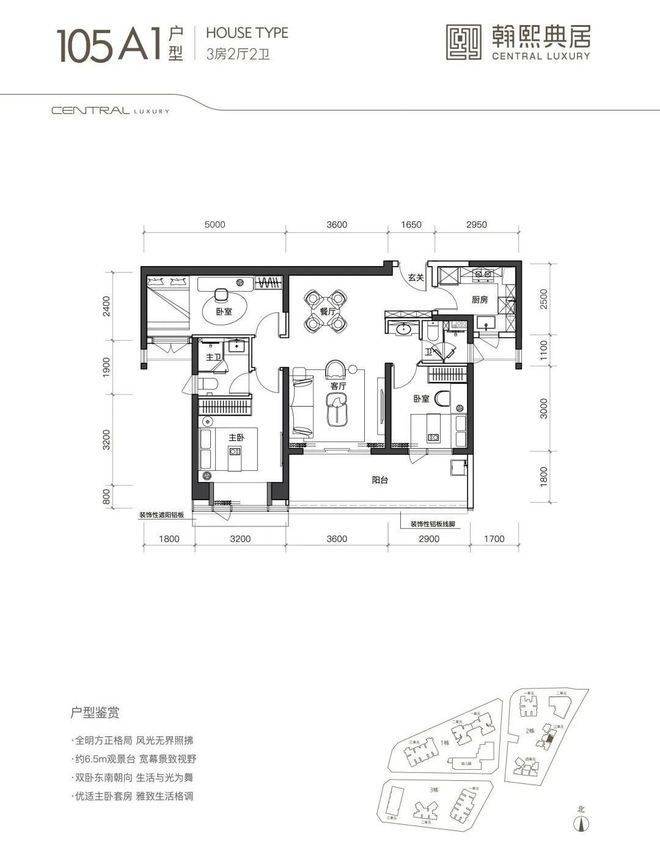 104㎡的3房2厅2卫,A1户型(2栋3单元03户型),设计的是竖厅类双龙抱珠格局,客厅3.6米开间,客餐厅一体化设计,3个卧室分别做到了主卧12.8㎡/次卧12㎡/次卧8.7㎡(包含墙体飘窗),客厅连接次卧出6.5米长的宽景大阳台,U型厨房,公卫三段式分离,得房率约90%(包含赠送),东南朝向。