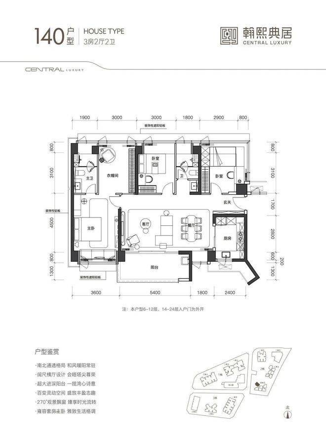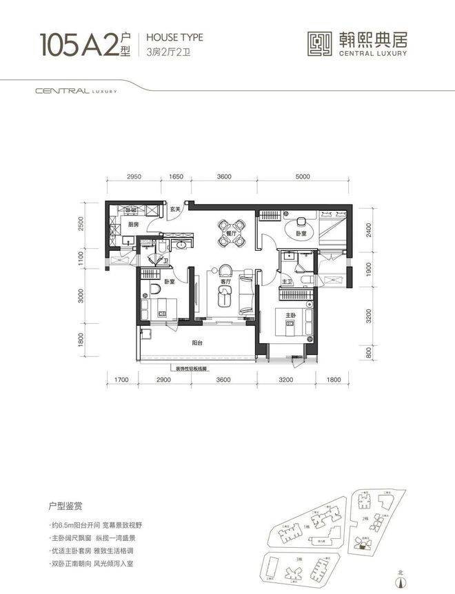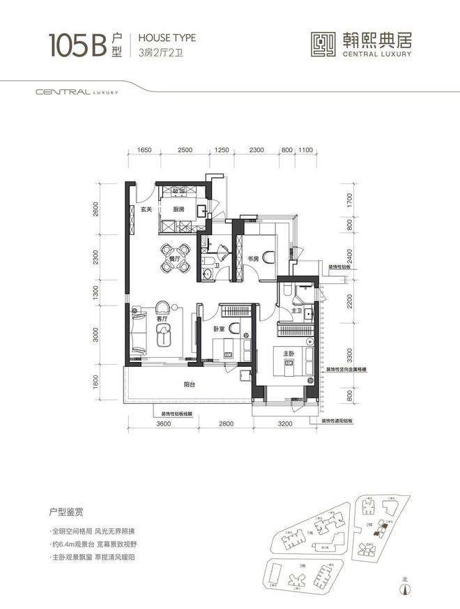 105㎡的3房2厅2卫,B户型(2栋3单元02/06户型),设计的是经典竖厅格局,客厅3.6米开间,LDKB一体化设计,三开间朝南,动静分区,3个卧室分别做到了主卧13.12㎡/次卧9.9㎡/次卧8.4㎡(包含墙体飘窗),客厅连接次卧出6.4米长的宽景大阳台,U型厨房,卫生间干湿分离,得房率约90%(包含赠送),正南或东南朝向。102㎡的3房2厅2卫,C户型(1栋1/2单元02户型),设计的是竖厅格局,客厅3.6米开间,LDK一体化设计,3个卧室分别做到了主卧16.93㎡/次卧9.24㎡/次卧8.96㎡(包含墙体飘窗),客厅连接次卧出6.4米长的宽景大阳台,U型厨房,卫生间干湿分离,得房率约90%(包含赠送),西南或东北朝向。