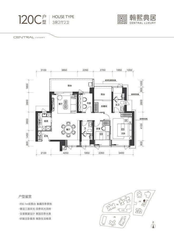 117㎡的3房2厅2卫,B户型(2栋4单元01.02.05/3栋2单元02/05户型),设计的是经典竖厅格局,客厅3.8米开间,LDKB一体化设计,3个卧室分别做到了主卧28.6㎡/次卧9.6㎡/次卧7.05㎡(包含墙体飘窗),客厅连接次卧出6.15米长的宽景大阳台,U型厨房,卫生间干湿分离,得房率约90%(包含赠送),东南或正东朝向。其实也可以改4房。120㎡的4房2厅2卫,C户型(2栋3单元01户型),设计的是竖厅格局,客厅3.85米开间,LDKB一体化设计,动静分区,4个卧室分别做到了主卧16.65㎡/次卧9.9㎡/次卧9.16㎡/次卧6.3㎡(包含墙体飘窗),客厅连接次卧出6.1米长的宽景大阳台,U型厨房,卫生间干湿分离,得房率约90%(包含赠送),西北朝向。117㎡的4房2厅2卫,D户型(3栋2单元06户型),设计的是横厅南北通透格局,客餐厅6.6米开间,四开间朝南,4个卧室分别做到了主卧17.35㎡/次卧9.8㎡/次卧9.1㎡/次卧8.05㎡(包含墙体飘窗),客餐厅出6.6米长的宽景大阳台,U型厨房,公卫三段式分离,得房率约90%(包含赠送),西南朝向。