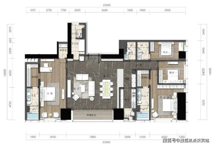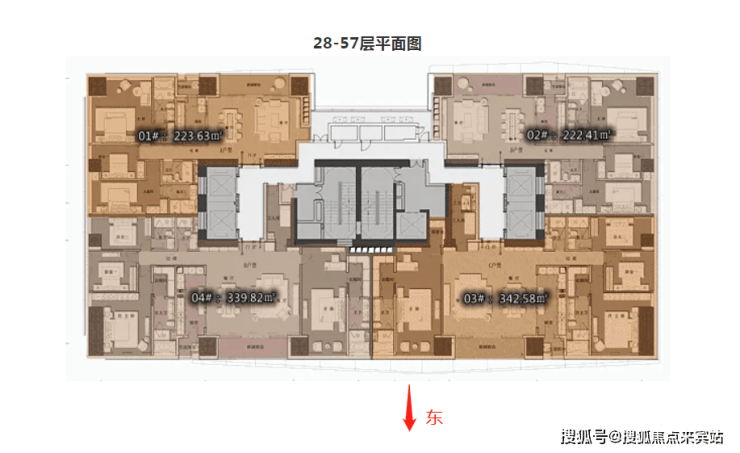 D2户型:约340㎡4房2厅4卫:B栋28-52F(高区),东朝向,户型与343㎡户型基本相同。