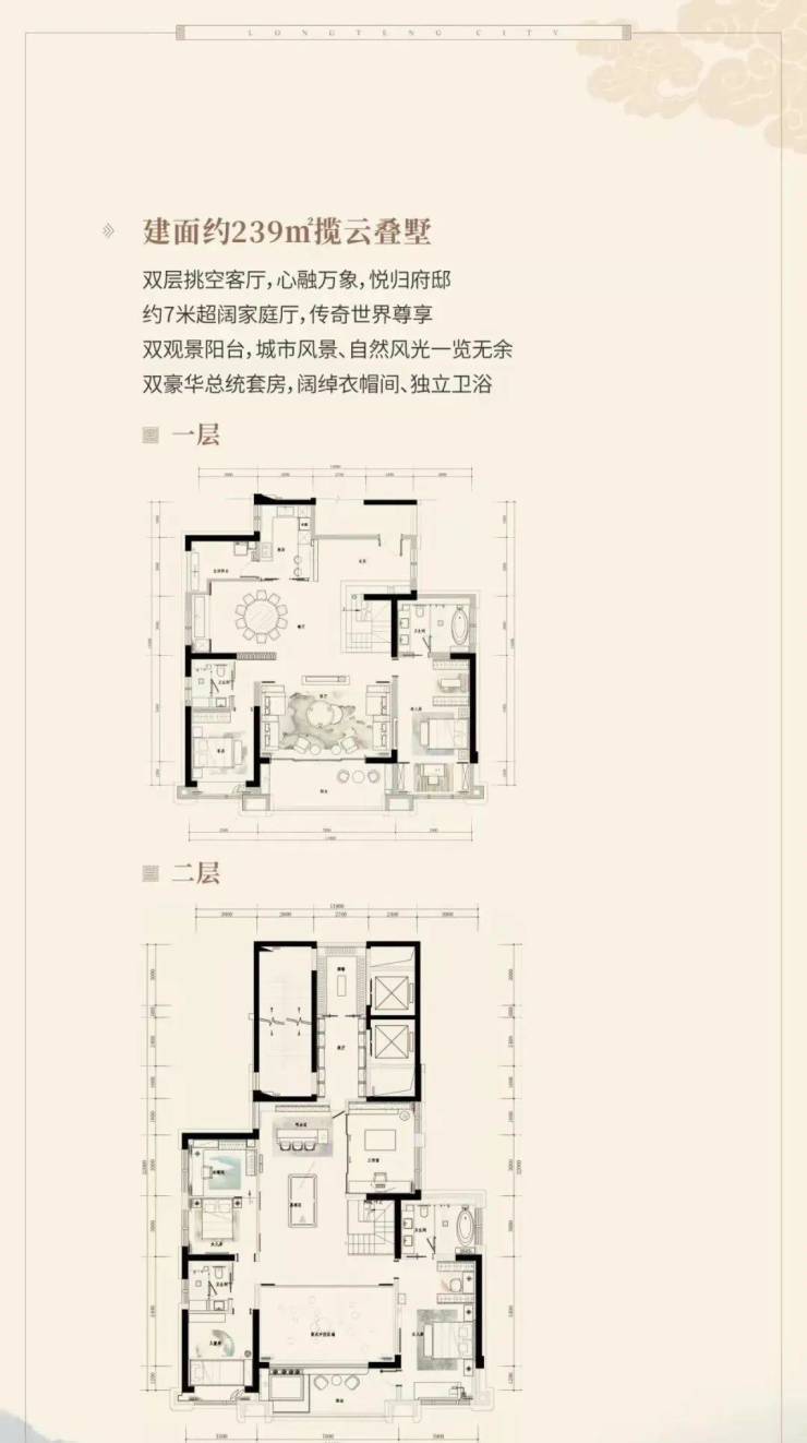建面约440-837㎡国风院墅(总价约800万-2500万/套),建面约239-255㎡揽云叠墅(总价约500万-600万/套)