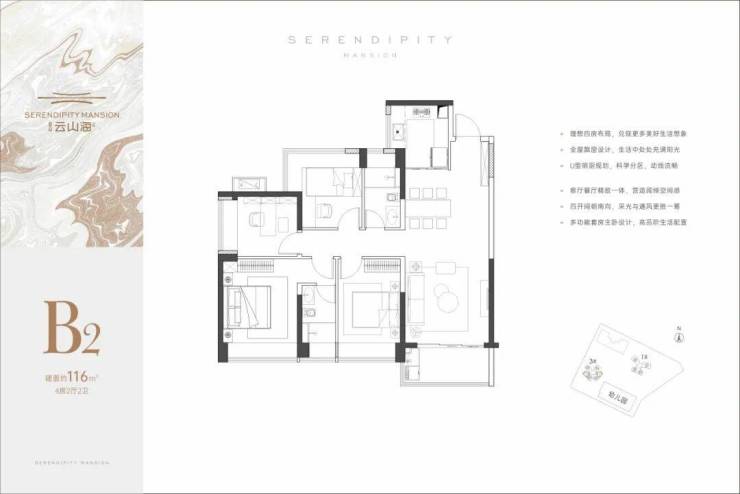 设计上跟建面约116㎡B2户型类似,不过公摊、尺寸和细节上有不同。该户型取消了小次卧的L型飘窗设计,采用了大阳台的设计横穿到次卧,主朝向的视野更开阔。动静分区,四开间南向。经典的竖厅格局,动静分离,一体化餐客厅让空间观感更通透。约6.8米南向阳台视野开阔,次卧连接阳台可以看到园林景观,绿意在前,在阳台晾晒衣服时也是一种享受。经典的竖厅格局,动静分离。客厅、厨房、餐厅和阳台也能实现空间一体化,构成家的核心区。
