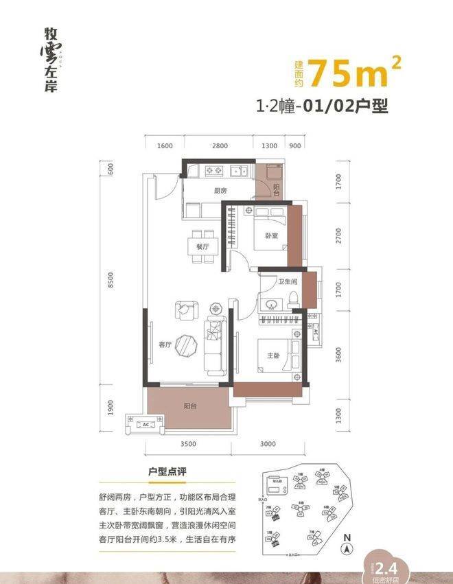 75㎡2房2厅1卫,双阳台,有一个生活小阳台,南向厅出阳台,每个房间都有小飘窗,采光宽敞性好!牧云左岸售楼处电话:400-013-9098