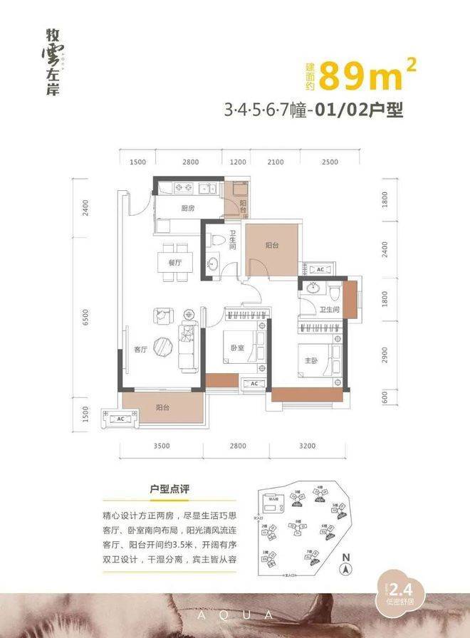 89㎡3房2厅2卫,双阳台,有一个生活小阳台,赠送的小阳台可做儿童房,89平米做小三房且两个卧室朝南还是非常不错的。客厅3.5米,两个卫生间舒适性三房。