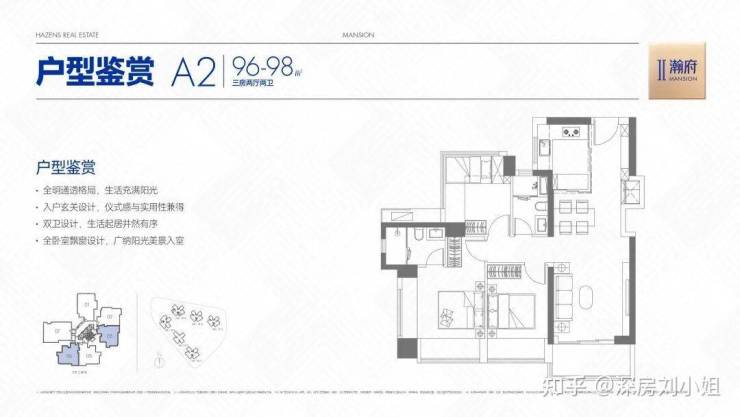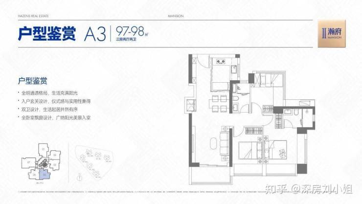 03/05/06(A2/A3)户型,竖厅三开间朝南格局,客厅3.5米开间,LDKB一体化,S墙设计预留冰箱卡槽位,主卧+1个次卧双飘窗。得房率约78%(不含赠送)。