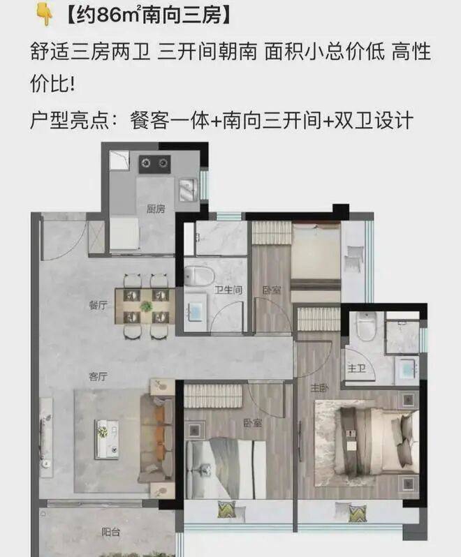 在售户型:75平3房两厅1卫,。86平3房两厅两卫,101平4房两厅两卫