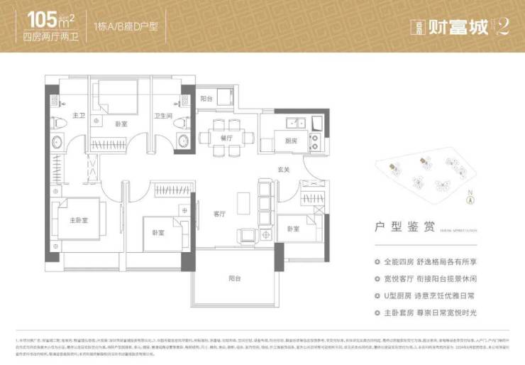 105㎡的4房2厅2卫,折后总价345-372万/套,单价3.28-3.54万/㎡。