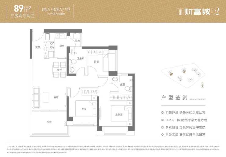 89㎡的3房2厅2卫,设计的是经典竖厅格局,客厅实测3.2米开间,LDKB一体化设计,动静分区,3个卧室分别做到了主卧12.35㎡/次卧8.22㎡/次卧6.19㎡(实测面积,去掉墙体),L型厨房,卫生间干湿分离,带1个小生活阳台,得房率约:74.92%(不含赠送),西南、东南及东北朝向。赠送面积8.3㎡,加上赠送得房率84.28%。