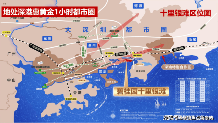 1个交通中心,每日多班次城际巴士往返深圳福田、罗湖、莲塘(目前十里银滩已有13000户香港业主,过关口岸更是有城际巴士直达碧桂园维港半岛;业主坐巴士单程仅需9.9元);2大高铁,惠阳站、惠东南站;3高速口,小径湾出口、亚婆角出口、其中维港半岛距海湾大桥管理中心出口仅1公里(直线距离),速达深圳,畅通粤港澳。