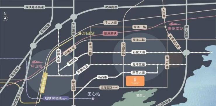 4大轨道:地铁14号线、16号线、厦深高铁、深大城际(在建)