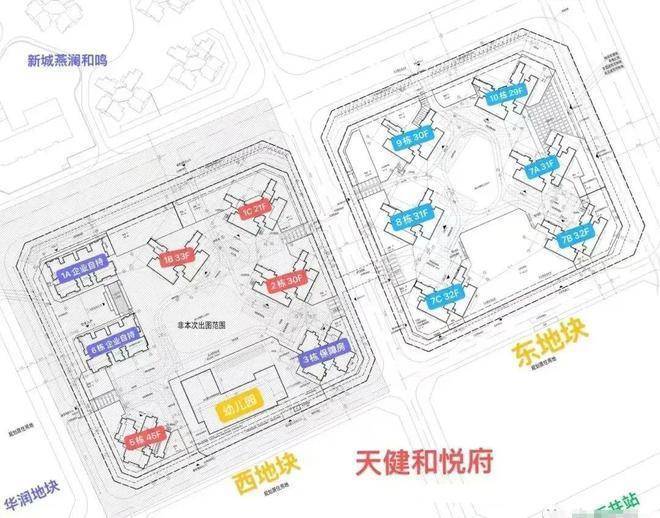 天健和悦府由天健集团打造,是在坪山的第一个项目,总占地面积约7.62万㎡,总建筑面积约32.8万㎡,计容建筑面积23.93万㎡,容积率4.77,绿化率40%,分东西2个地块开发,共由13栋21-45层高的住宅组成,总规划2833户,其中可售商品房1740套,规划停车位2599个,车位占比约1:0.91。
