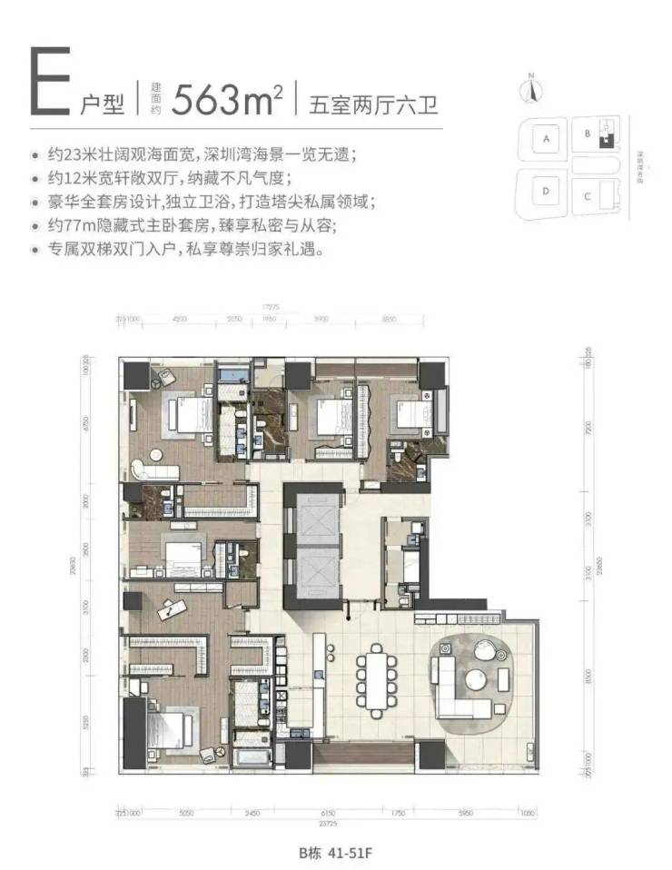 项目主打约340-580㎡的4-5房环幕海景公寓,配备约2.45米宽幅玻璃,完美呈现深圳湾绝美景观。全屋采用一线国际精装品牌定制,打造塔尖生活典范。